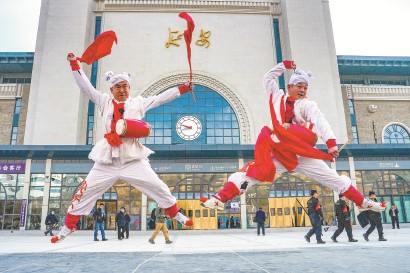 2025年12月26日,当地群众在延安火车站前表演安塞腰鼓。当日,西安至延安高速铁路正式开通运营,革命圣地延安迈入“高铁时代”。 新华社发