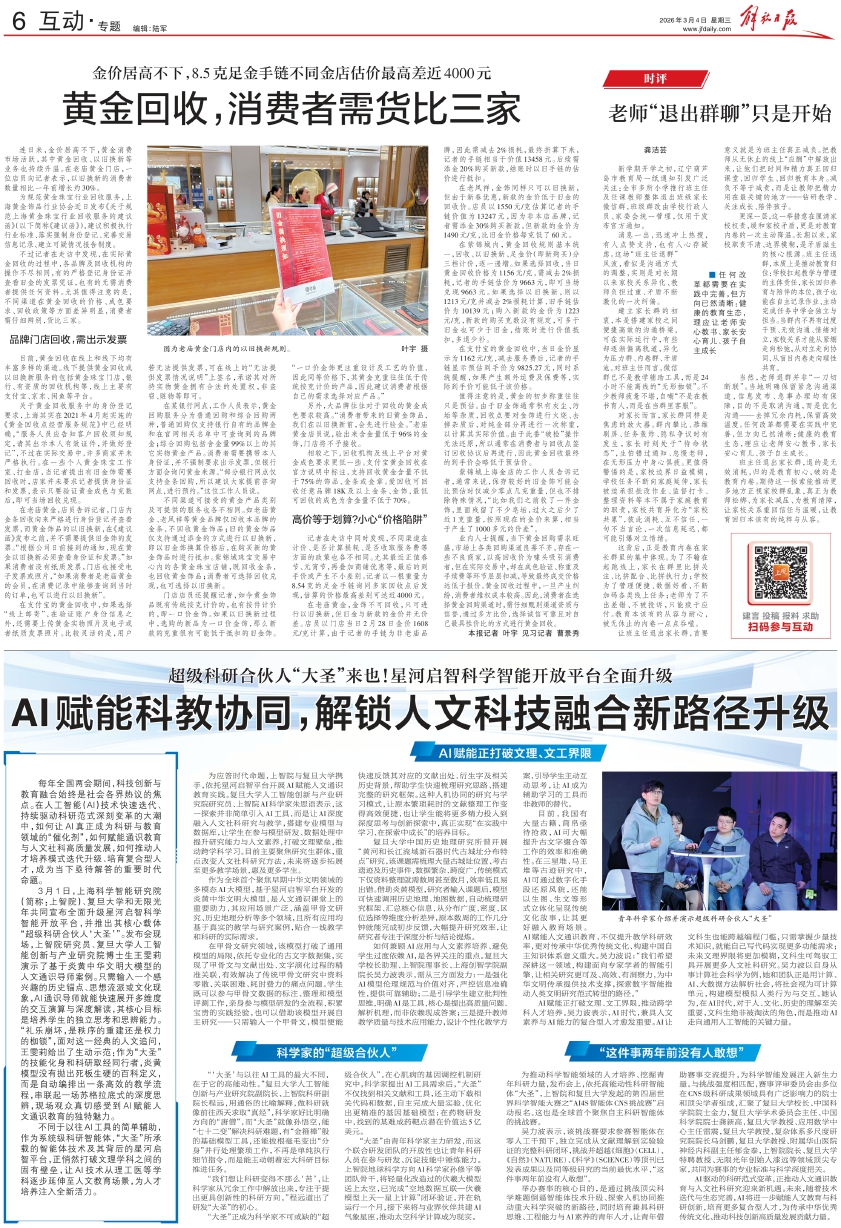 为应答时代命题,上智院与复旦大学携手,依托星河启智平台开展AI赋能人文通识教育实践。复旦大学人工智能创新与产业研究院研究员、上智院AI科学家朱思语表示,这一探索并非简单引入AI工具,而是让AI深度融入人文社科研究与教学,搭建专业模型与数据库,让学生在参与模型研发、数据处理中提升研究能力与人文素养,打破文理壁垒,推动跨学科学习。目前主要聚焦研究生群体,重点改变人文社科研究方法,未来将逐步拓展至更多教学场景,惠及更多学生。