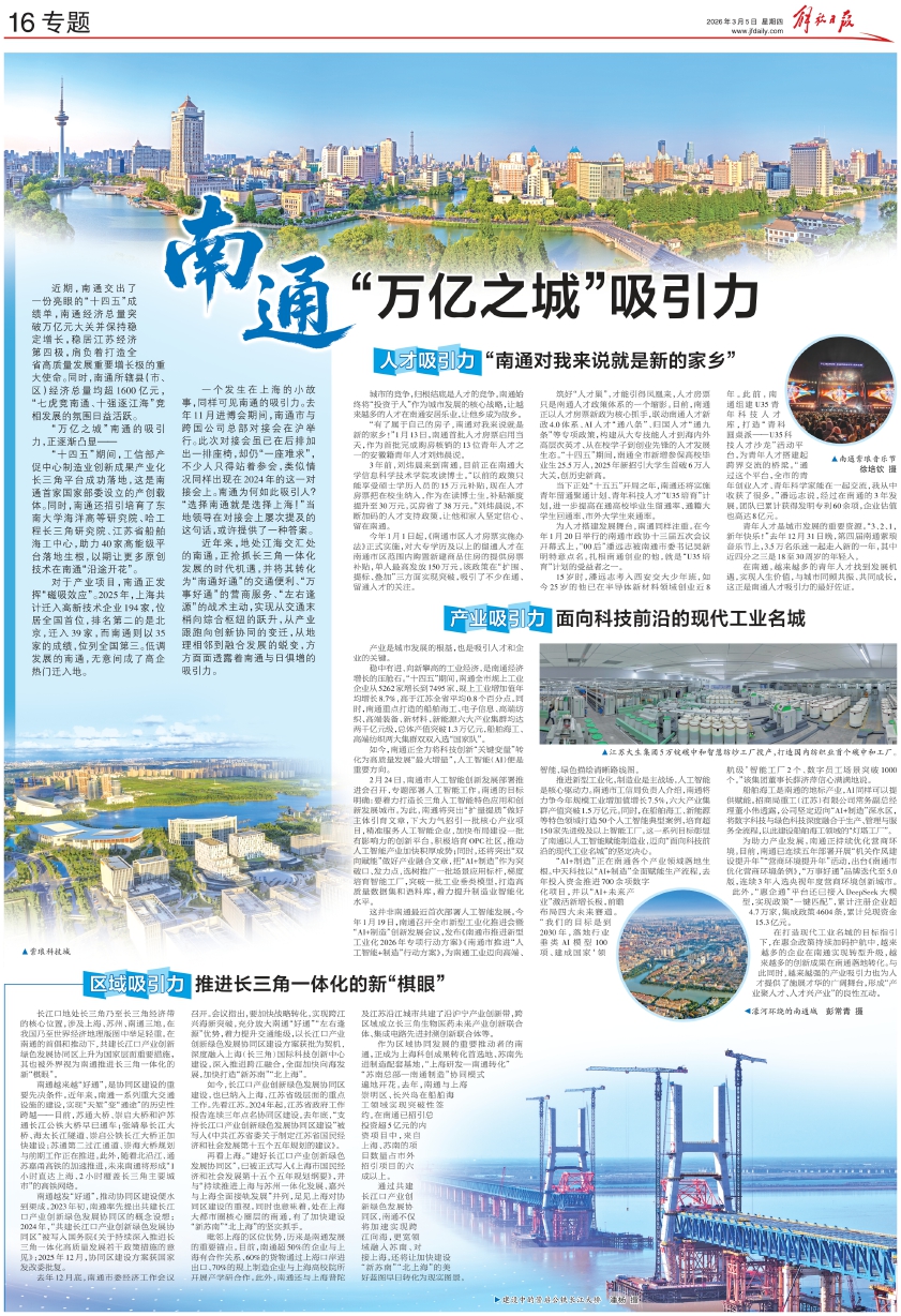近年来,地处江海交汇处的南通,正抢抓长三角一体化发展的时代机遇,并将其转化为“南通好通”的交通便利、“万事好通”的营商服务、“左右逢源”的战术主动,实现从交通末梢向综合枢纽的跃升,从产业跟跑向创新协同的变迁,从地理相邻到融合发展的蜕变,方方面面透露着南通与日俱增的吸引力。