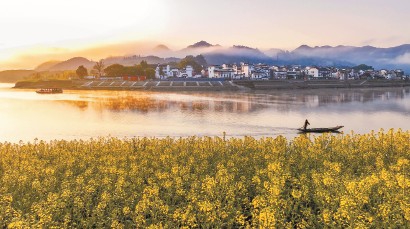 安徽省黄山市歙县新安江畔的油菜花竞相绽放(2025年3月20日摄)。 新华社发