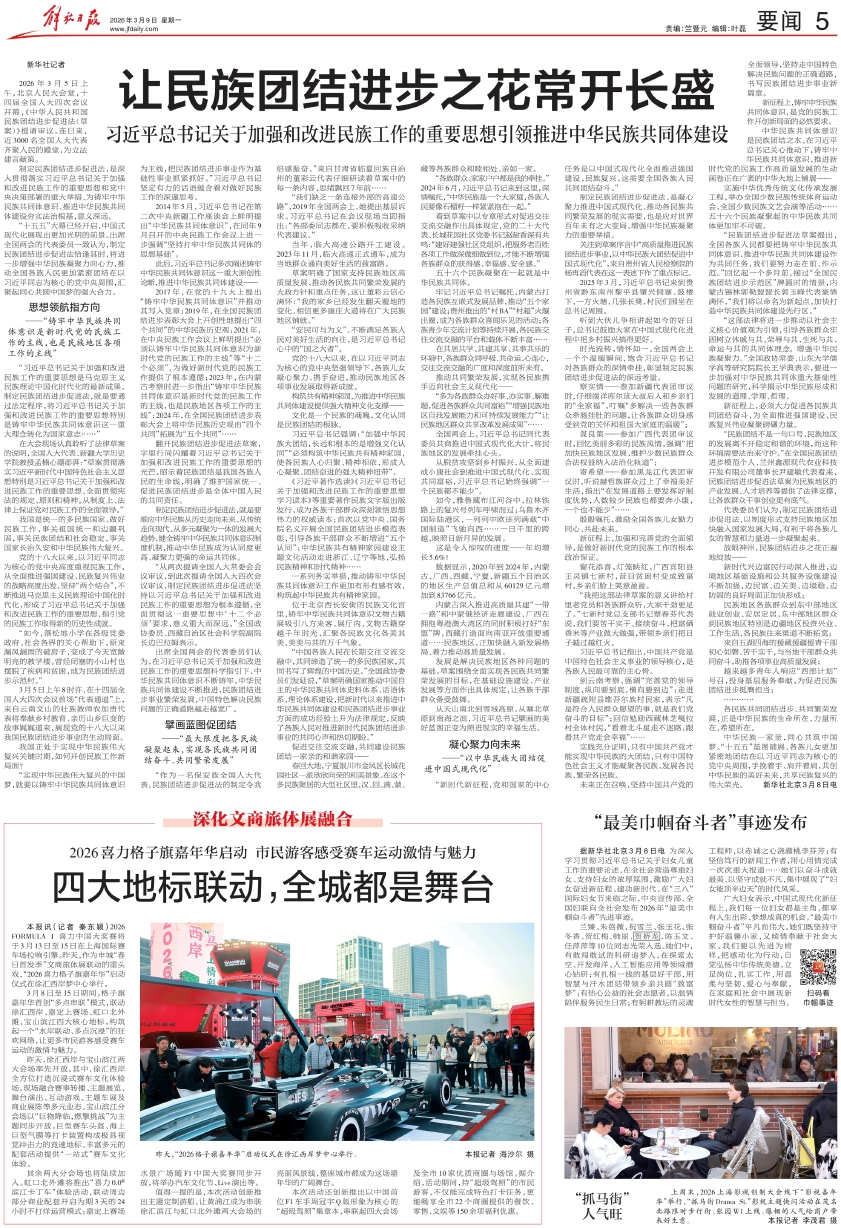 中华民族一家亲,同心共筑中国梦。“十五五”蓝图铺展,各族儿女更加紧密地团结在以习近平同志为核心的党中央周围,手挽着手、肩并着肩,共创中华民族的美好未来,共享民族复兴的伟大荣光。 新华社北京3月8日电