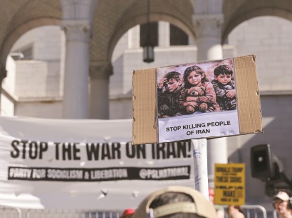 7日,在美国加利福尼亚州洛杉矶,人们集会抗议对伊朗的军事打击。新华社发 -