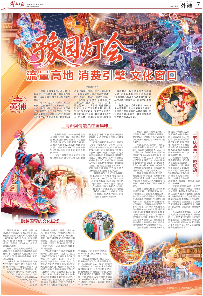 豫园灯会期间活动是传统文化的展示窗口,更是消费的盛宴。黄浦区以灯会为核心抓手,深度推动文商旅体展多业态跨界联动、融合共生。