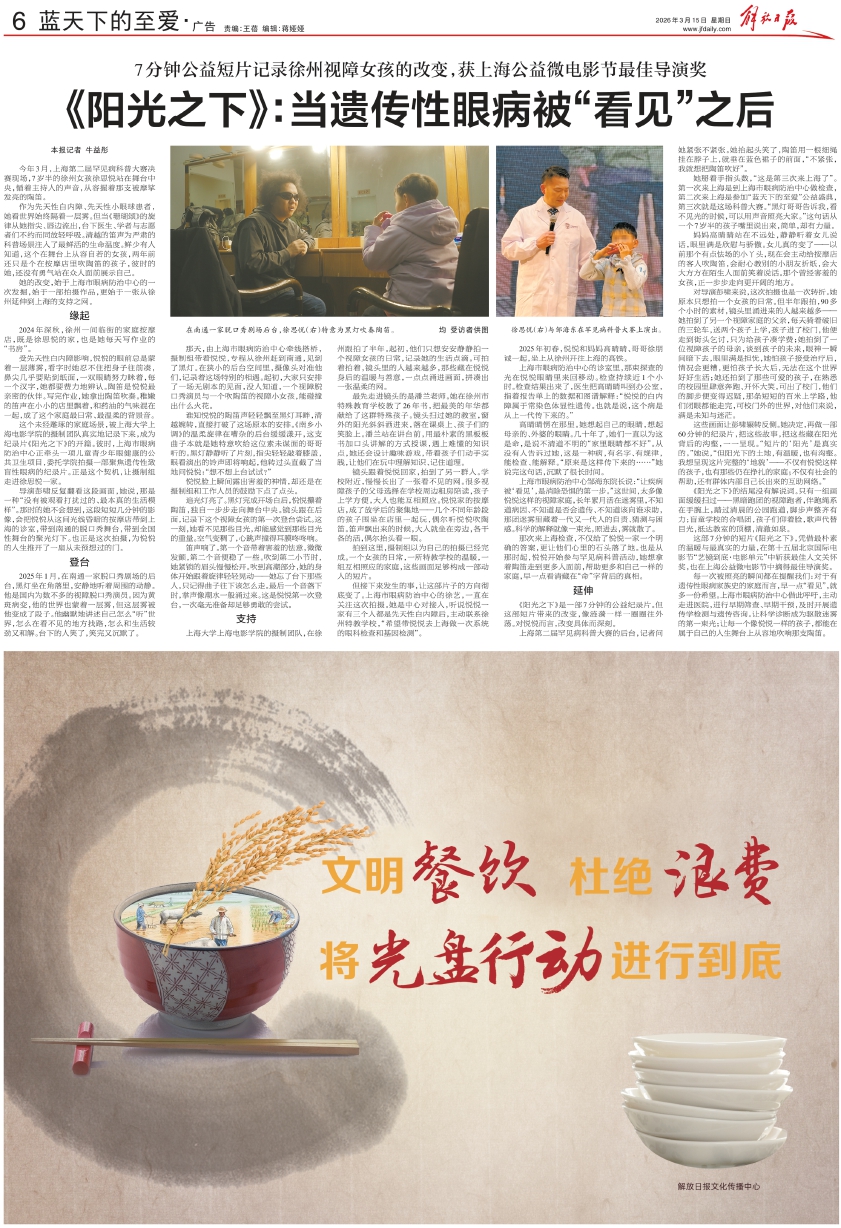 这个未经雕琢的家庭场景,被上海大学上海电影学院的摄制团队真实地记录下来,成为纪录片《阳光之下》的开篇。彼时,上海市眼病防治中心正牵头一项儿童青少年眼健康的公共卫生项目,委托学院拍摄一部聚焦遗传性致盲性眼病的纪录片。正是这个契机,让摄制组走进徐思悦一家。