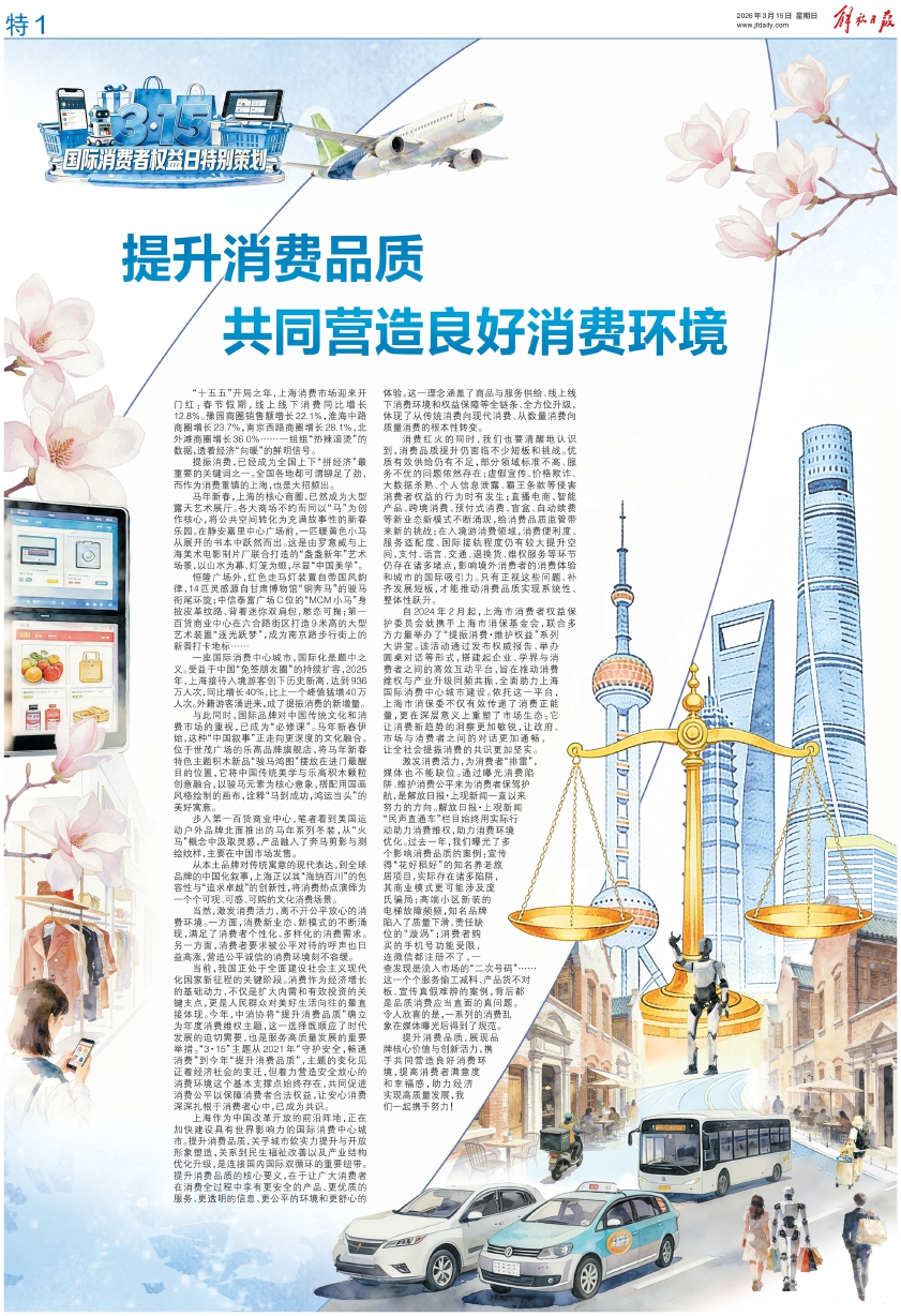 当前,我国正处于全面建设社会主义现代化国家新征程的关键阶段。消费作为经济增长的基础动力,不仅是扩大内需和有效投资的关键支点,更是人民群众对美好生活向往的最直接体现。今年,中消协将“提升消费品质”确立为年度消费维权主题,这一选择既顺应了时代发展的迫切需要,也是服务高质量发展的重要举措。“3·15”主题从2021年“守护安全,畅通消费”到今年“提升消费品质”,主题的变化见证着经济社会的变迁,但着力营造安全放心的消费环境这个基本支撑点始终存在,共同促进消费公平以保障消费者合法权益,让安心消费深深扎根于消费者心中,已成为共识。