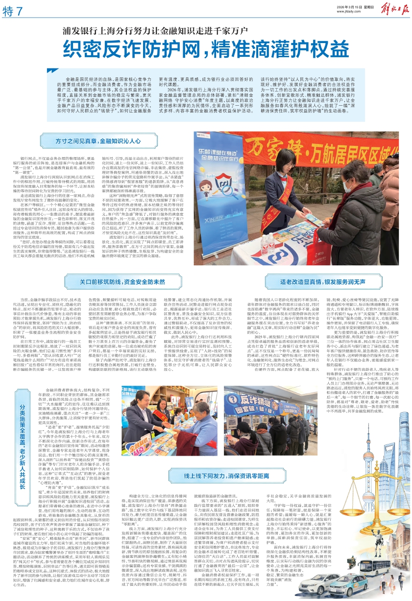 “适老”更“护老”,温情服务托起“夕阳红”。今年是浦发银行上海分行与上海老年大学携手合作的第十个年头。十年来,双方不断深化合作内涵,创新合作形式。在每年的“老年金融知识宣传周”期间,活动特邀资深警官、金融专家走进老年大学课堂,现身说法。他们用一个个触目惊心的真实案例,深入剖析“以房养老”“保健品投资”“黄昏恋诈骗”等专门针对老年人的诈骗手法,手把手教老人如何识别陷阱、如何保护个人信息。这种“订单式”“互动式”的教学,深受老年学员欢迎,帮助他们筑起了防范诈骗的“心理防火墙”。