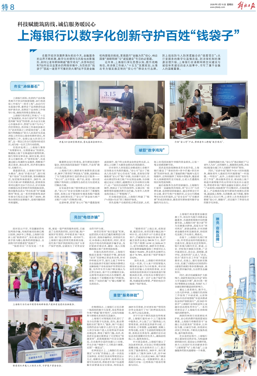 近年来,上海银行深化思想认知,提升战略地位,将消保工作嵌入“十五五”发展规划。从推出专为银发族定制的“安心付”移动支付品牌,到上线技防与人防深度融合的“银盾项目”;从厅堂服务的数字化温情改造,到消保机制的溯源治理升级,上海银行在清朗网络空间建设与诚信体系建设的宏大叙事中,书写了属于金融人的温暖篇章。