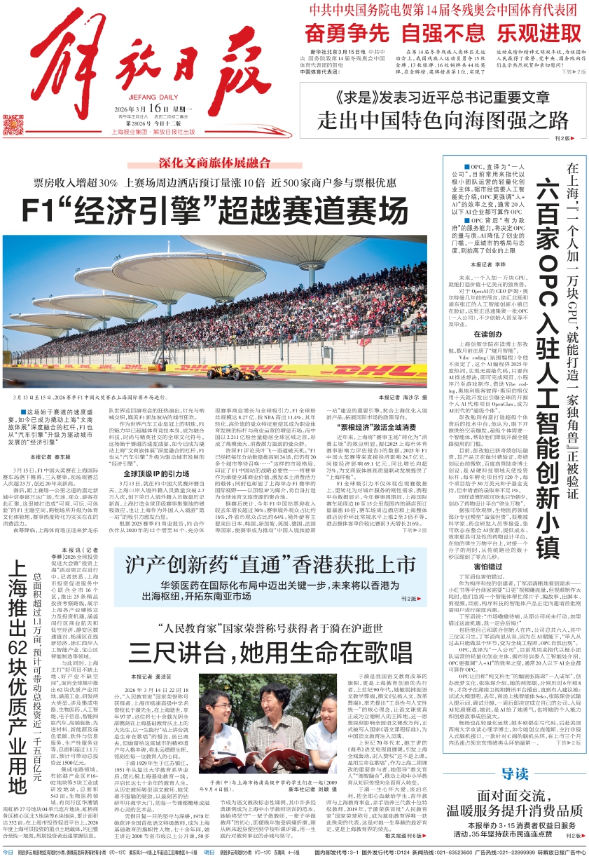 F1全球吸引力不仅体现在观赛数据上,更转化为对城市服务的刚性需求。携程平台数据显示,今年赛事周期间,上海国际赛车场周边10至15公里范围内的酒店预订量暴涨10倍,赛车场周边酒店和上海整体酒店房价环比常规水平上涨2至3倍不等,酒店整体客单价较比赛前3天增长216%。下转 2版(上接第1版)同时,赛事期间飞往上海的机票预订量同比实现两位数增长,凸显上海正成为全球体育、文化与娱乐目的地。