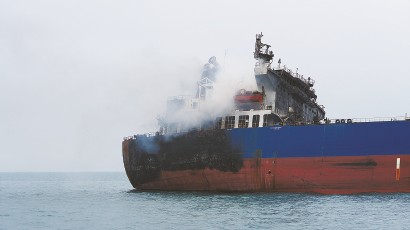 3月12日在伊拉克巴士拉省附近海域拍摄的遭袭油轮。 新华社发 -