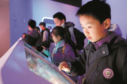 在上海科技馆内,小朋友在游戏互动中学习科技知识。 本报记者 赖鑫琳 摄 -