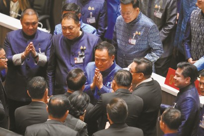 3月19日,在位于泰国曼谷的国会大厦,自豪泰党候选人阿努廷·参威拉军(中)庆祝当选。