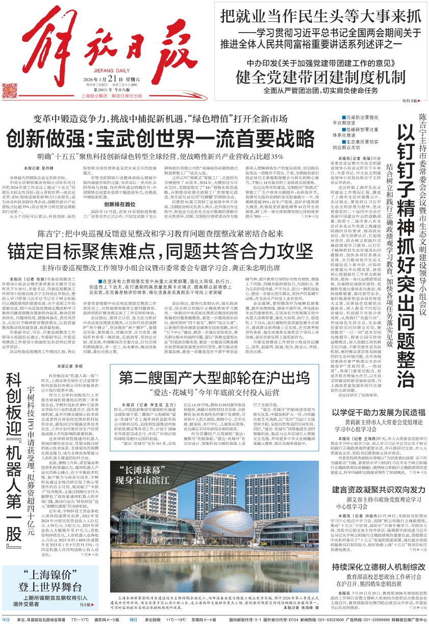 会议听取上海市生态文明建设工作情况汇报,播放了上海市生态环境警示片。会议指出,要坚持以习近平生态文明思想为指导,坚决贯彻党的二十届四中全会对美丽中国建设作出的战略部署,按照十二届市委八次全会对未来五年美丽上海建设明确的目标要求,提高政治站位,深化思想认识,扛起政治责任,结合树立和践行正确政绩观学习教育,以钉钉子精神抓好生态环境突出问题整治,加快各项任务落实见效,全力推动我市生态文明建设迈上新台阶。污染防治要强化平台期攻坚,持续用心把基础性工作抓实抓细抓深,提高一体化运维管理成效,加强跨区域联防联控。低碳转型要注重体系化推进,保持战略敏捷,强化韧性安全,做好能源和制造业绿色转型大文章,完善绿色低碳供应链体系。深入推进节约型社会建设,巩固提升垃圾分类成效,认真践行“光盘行动”,养成绿色生活方式。生态惠民要切实回应群众关切,继续推进“一江一河”滨水空间功能提升,探索公园可持续运维模式,深入挖掘江南农耕文化内涵。不断完善社会共治机制,更好解决老百姓反映强烈的生态环境问题。全市各级党委政府要严格落实生态环境保护“党政同责、一岗双责”,各部门要密切配合,形成齐抓共管强大合力,以生态文明建设的新进展新成效,为上海高质量发展和现代化建设作出新贡献。