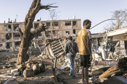 3月22日,在以色列南部城市迪莫纳,人们在遭袭地点的废墟中查看情况。 新华社 发