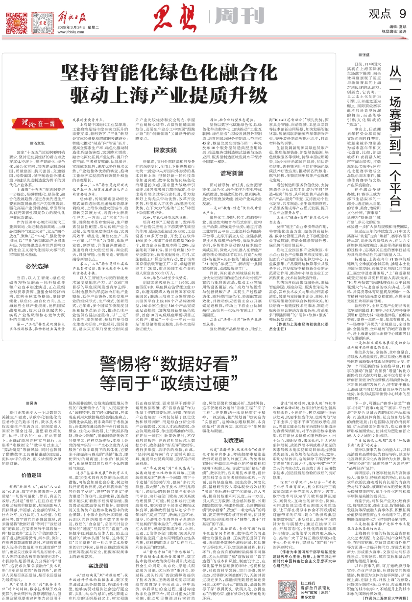 上海是中国近代工业发源地,工业始终是城市综合实力跃升的重要支撑。新形势下,“三化”转型是实体经济提质增效的关键路径:智能化推动“制造”向“智造”跃升、提高全要素生产率,绿色化推动制造体系绿色转型、实现降本增效,融合化深化拓展产业边界、提升价值空间。三者相互赋能、协同演进,实现成本优势、速度优势向技术优势、产业链整体优势的转变,推动工业经济实现质的有效提升和量的合理增长。