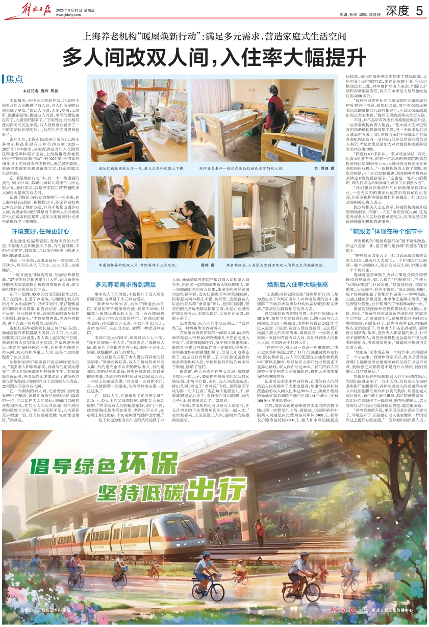 去年2月,上海市民政局印发的《上海市养老机构品质提升三年行动方案(2025—2027年)》中提出,从更好满足老年人长期居住和生活照料需求出发,上海将推动养老机构进行“暖屋焕新行动”:到2027年,全市运行10年以上的保基本养老机构,通过居室装修、更新或添置家具和设备等方式,打造家庭式生活空间。