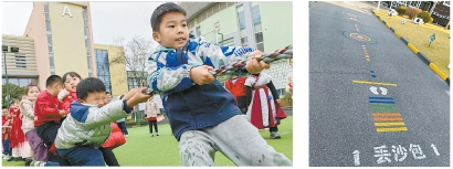 嘉定区华江小学参加体育活动的学生(左图)和随处可见的游戏区域(右图)。 资料图片