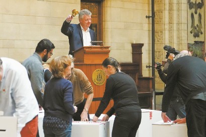 3月24日,在丹麦哥本哈根市政厅,选举委员会官员摇铃宣布选举投票开始。 新华社发 -