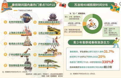 同程旅行数据显示,4月1日至6日,预订出行人群中学生群体占近三分之一。去哪儿旅行数据显示,清明春假期间,江苏南通、常州、无锡等官宣春假的城市机票预订量均实现翻倍增长。亲子客群成为主力,18岁以下青少年民航乘客占比约两成,景区青少年游客预订量增长超3倍,踏青赏花、亲子研学、主题乐园等符合青少年需求的类型增长明显。