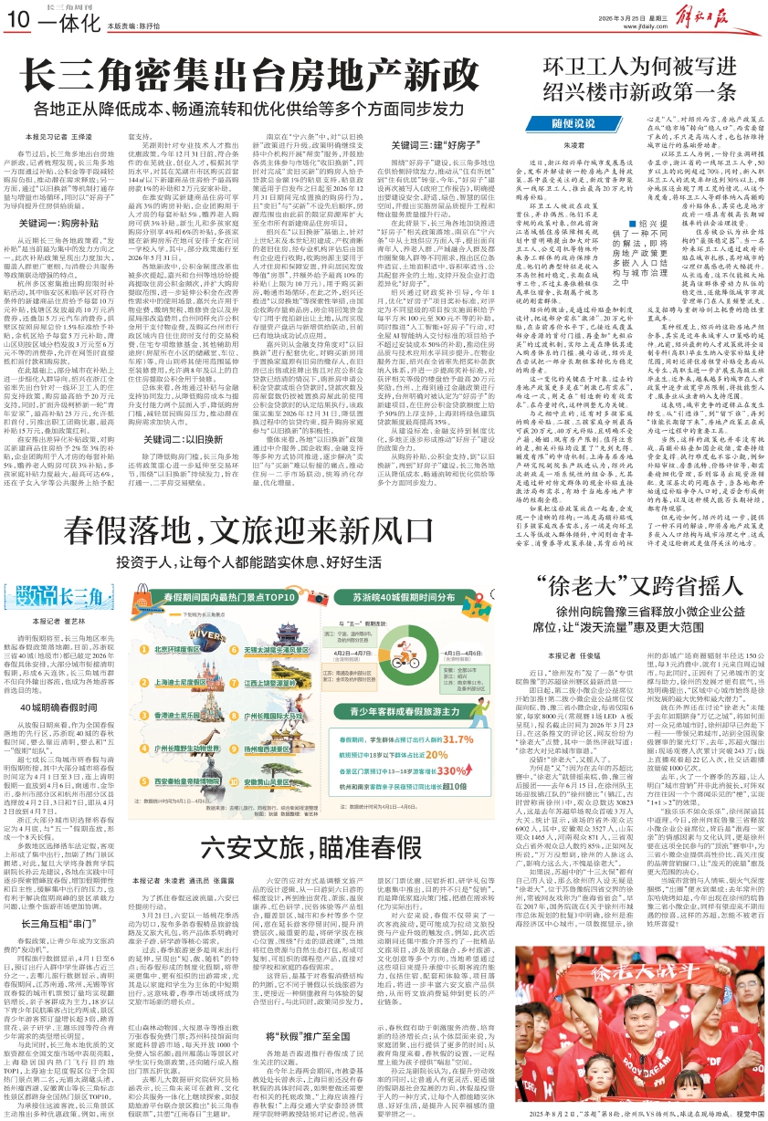 清明假期将至,长三角地区率先掀起春假政策落地潮。目前,苏浙皖三省40城(地级市)都已敲定2026年春假具体安排,大部分城市衔接清明假期,形成6天连休。长三角城市群不但向外输出客流,也成为各地游客首选目的地。