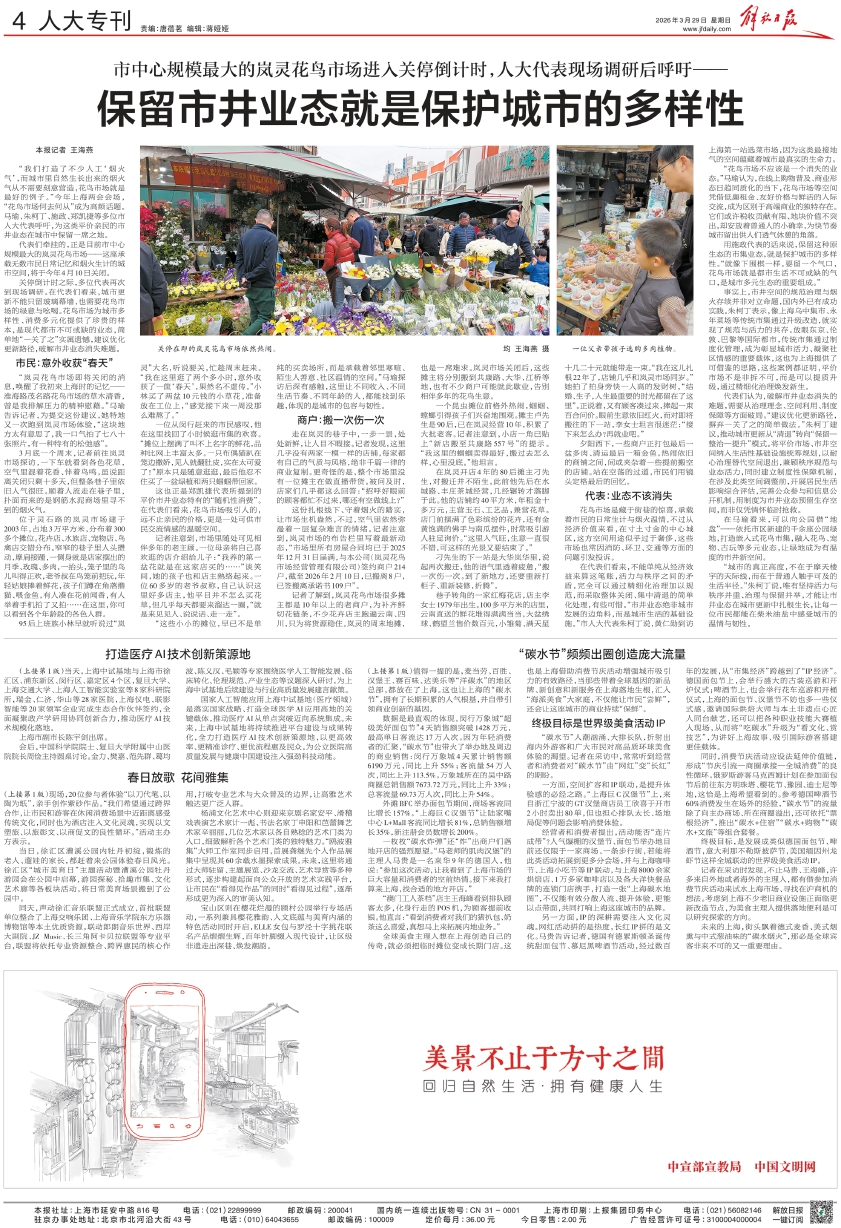 “我们打造了不少人工‘烟火气’,而城市里自然生长出来的烟火气从不需要刻意营造,花鸟市场就是最好的例子。”今年上海两会会场,“花鸟市场何去何从”成为高频话题。马瑜、朱柯丁、施政、郑凯捷等多位市人大代表呼吁,为这类平价亲民的市井业态在城市中保留一席之地。
