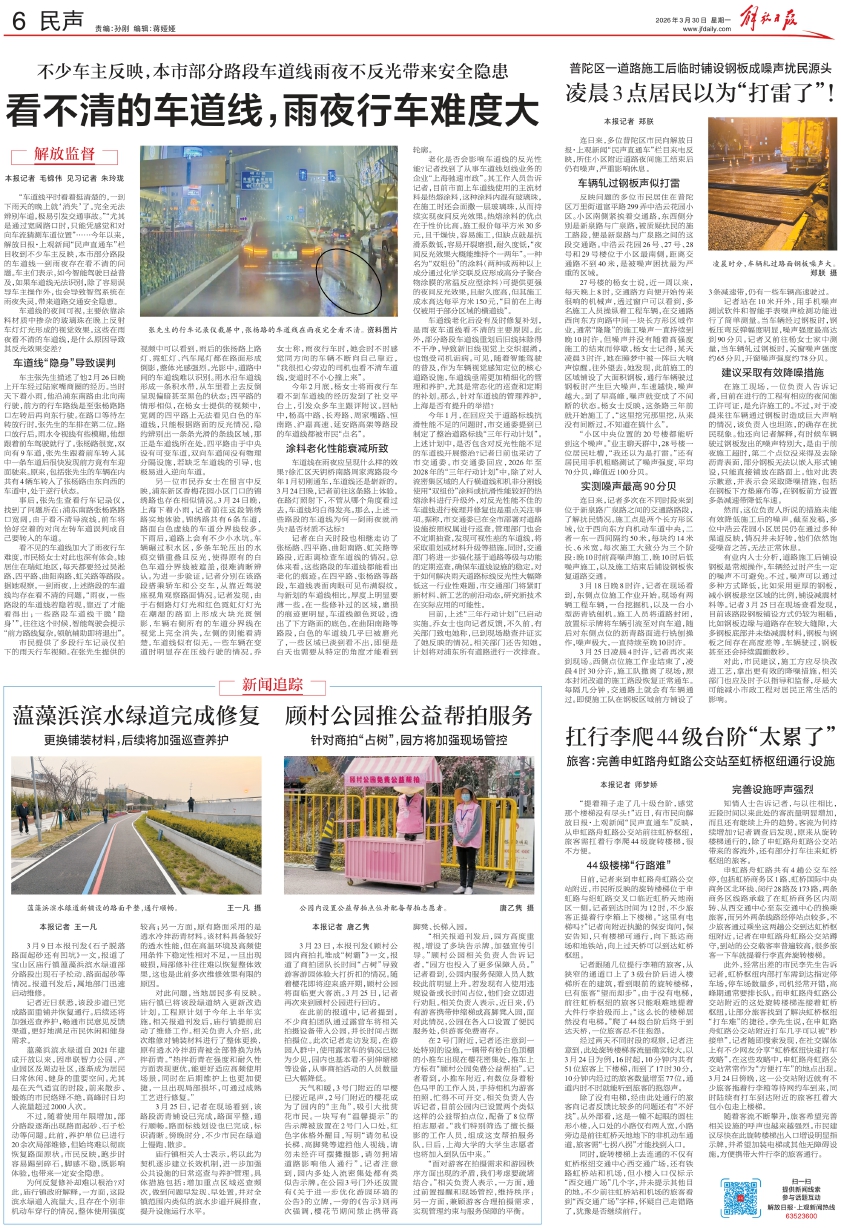 3月9日本报刊发《石子脱落路面起砂还有凹坑》一文,报道了宝山区庙行镇蕰藻浜滨水绿道部分路段出现石子松动、路面起砂等情况。报道刊发后,属地部门迅速启动维修。