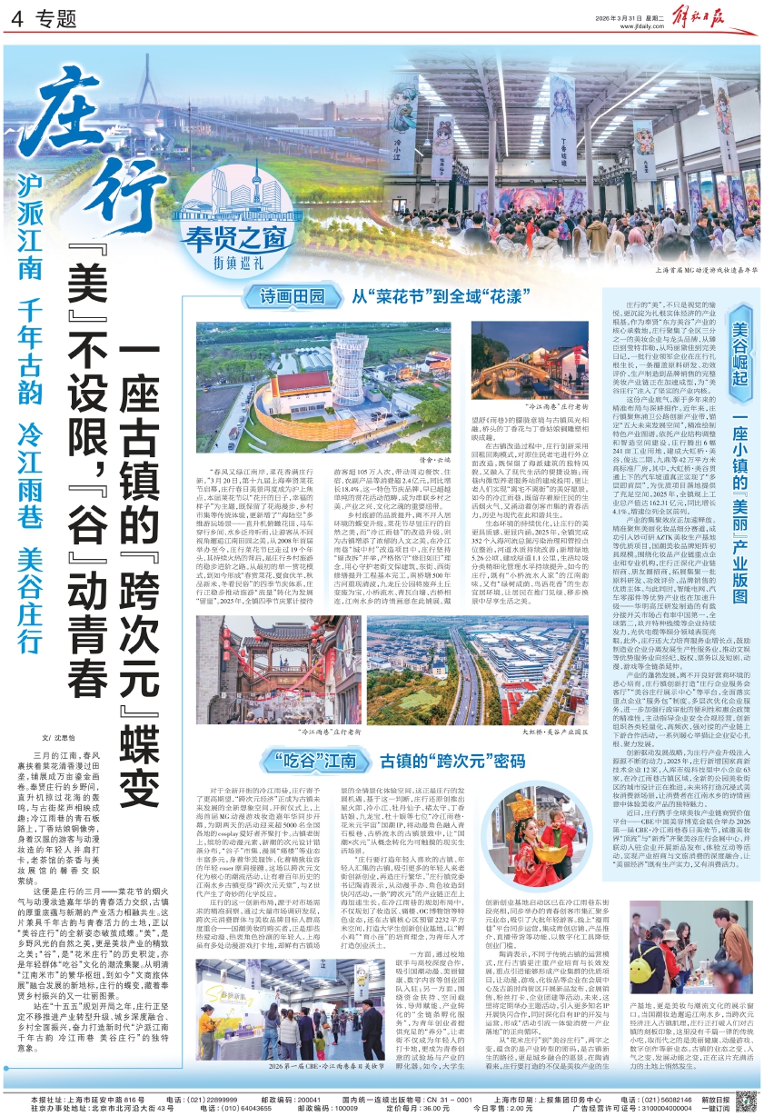 这便是庄行的三月——菜花节的烟火气与动漫妆造嘉年华的青春活力交织,古镇的厚重底蕴与新潮的产业活力相融共生。这片兼具千年古韵与青春活力的土地,正以“美谷庄行”的全新姿态破茧成蝶。“美”,是乡野风光的自然之美,更是美妆产业的精致之美;“谷”,是“花米庄行”的历史积淀,亦是年轻群体“吃谷”文化的潮流集聚。从明清“江南米市”的繁华枢纽,到如今“文商旅体展”融合发展的新地标,庄行的蝶变,藏着奉贤乡村振兴的又一壮丽图景。