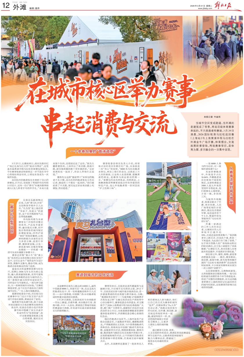 赛事组委会相关负责人介绍,将领取点设在南京东路世纪广场,本身就是一次“有心”的安排。“8000名马拉动跑者来领包,再加上他们的亲友,这就是上万人次的客流。让这些人走进商圈、接触黄浦的商业,是赛事与商业联动的第一步。”参赛包内由光明乳业、光明肉业、上海糖酒集团等赛事高级合作伙伴提供的特色产品,也让外地跑者第一时间尝到“沪上经典口味”。