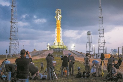 3月31日,在美国佛罗里达州肯尼迪航天中心,人们架设摄像机拍摄美国新一代登月火箭“太空发射系统”及其搭载的“猎户座”飞船。新华社发 -