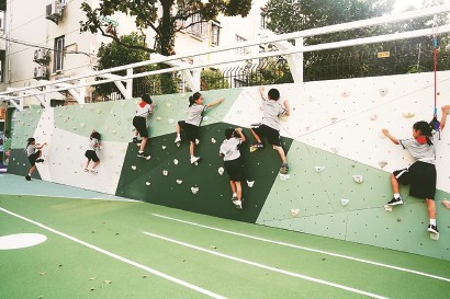 浦东新区竹园小学以一场“空间革命”,在有限场地里为孩子们挤出运动空间。去年,学校取消了几十个教师停车位,将这片区域铺上塑胶跑道,改造成“FUN肆乐跑区”;中庭原本闲置的小花园也被精心改造,增设了绳网、梅花桩、肋木架和爬竿,打造成攀爬综合活动区。学校还向立体空间要资源,在围墙上增设攀岩点,在屋顶开辟兼具安全性与挑战性的“勇敢者之路”,就连走廊也布置了摸高墙,让不大的校园变成了“无处不运动”的生态空间。