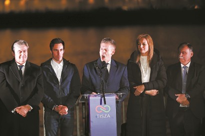 4月12日,在匈牙利首都布达佩斯,匈牙利蒂萨党领导人毛焦尔·彼得(中)在胜选晚会上讲话。