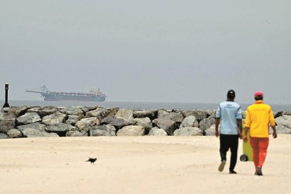 4月13日,阿联酋沙迦沿岸,一艘货船在霍尔木兹海峡附近的波斯湾海域航行。 视觉中国