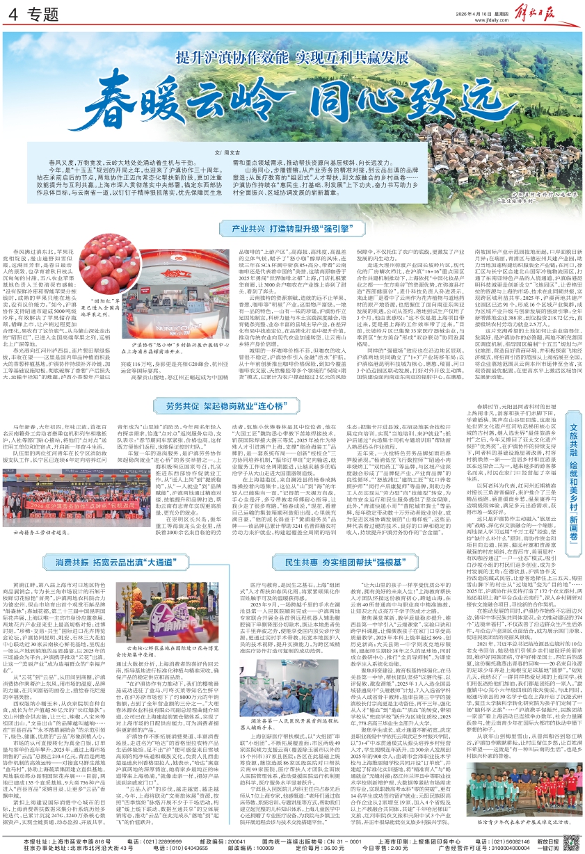 山海同心,步履铿锵。从产业劳务的精准对接,到云品出滇的品牌塑造;从医疗教育的“组团式”人才帮扶,到文旅融合的乡村画卷……沪滇协作持续在“惠民生、打基础、利发展”上下功夫,奋力书写助力乡村全面振兴、区域协调发展的崭新篇章。