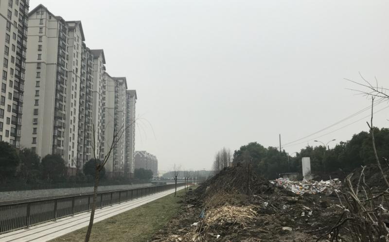 和想象中的绿色走廊差距有点大:从合生城邦四期高层远远看下去,河北岸的部分绿化带荒芜脏乱,弹簧床垫、沙发等生活垃圾堆成了一座小山,加上周边尚未拆除的断壁残垣,看起来似乎进行过拆违,但垃圾还未及时清理。由于疏于管理,这里逐渐沦为周边居民种菜、抛掷生活废品的地方。
