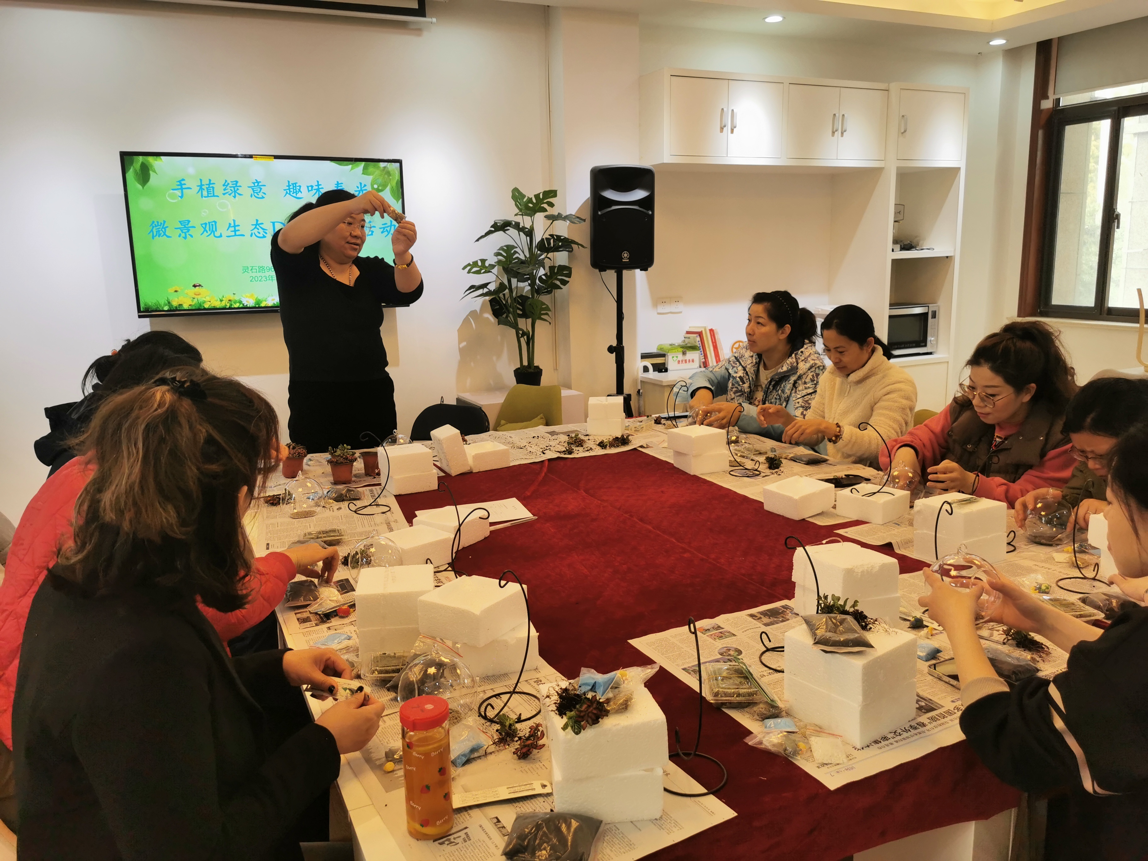 灵石路963弄居委会举办了一场以“手植绿意,趣味春光”为主题的绿植微景观自制活动,邀请了一群热爱大自然的年轻人前来体验,以小小的世界装载无限创意,留住绿意春光。