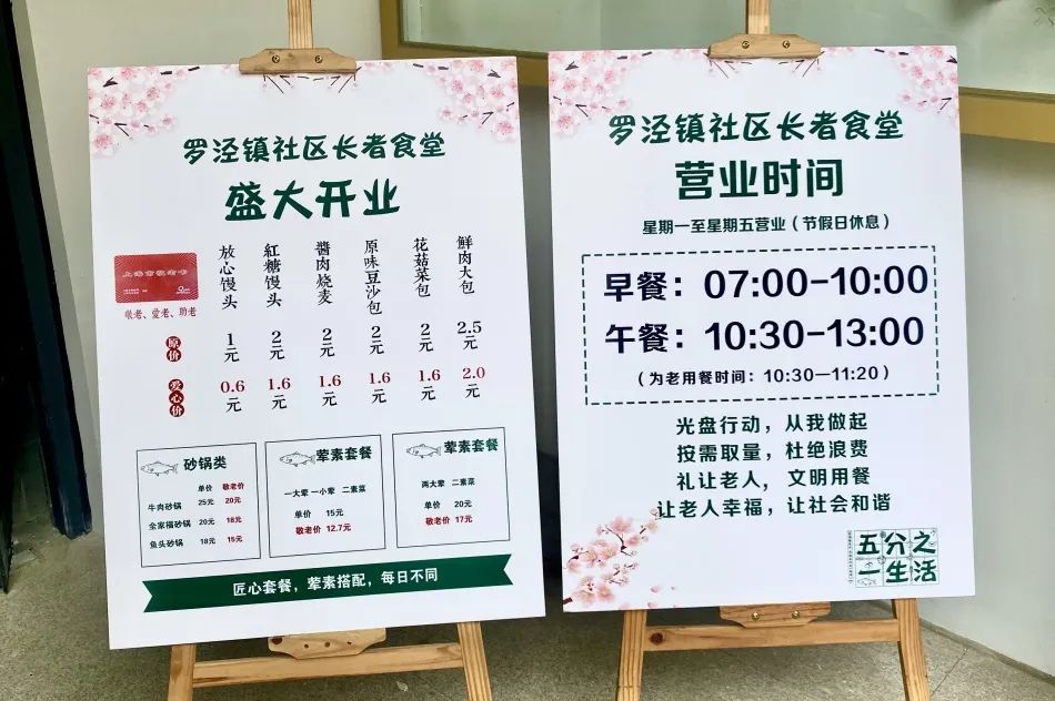 这家社区长者食堂由罗泾镇打造,委托五分之一品牌管理有限公司运营,工作日每天供应早餐和午餐。早餐主要供应各种口味的包子和白粥,价格在1元至2.5元之间,使用敬老卡购买包子能享受6-8折的优惠价。午餐供应不同标准的荤素套餐和各种砂锅,价格十分亲民。