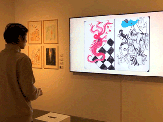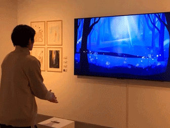 本次展览也得到上海音乐学院数字媒体艺术学院的技术支持,制作了展厅入口处的交互艺术屏《润物》和设置于展厅内部便于观众翻阅艺术家们手稿的交互体验装置《灵感森林》。