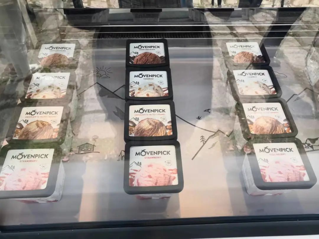 在瑞士莫凡彼冰淇淋店前,记者看到,透明柜台中,放置着精致的甜品;整洁的墙面上,挂着清晰的《便民饮食店临时备案公示卡》。