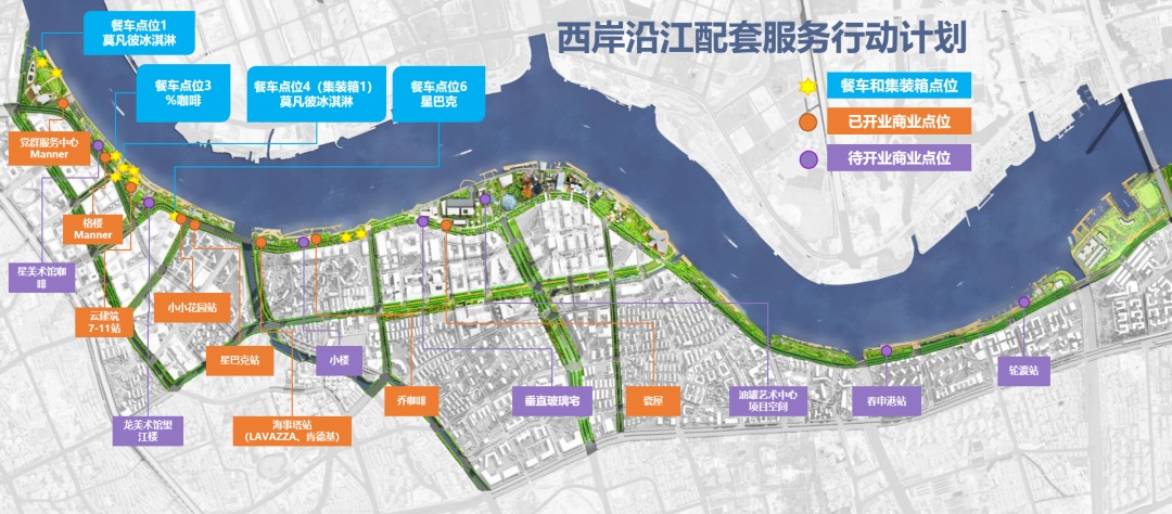 据悉,近期正式开业的%Arabica咖啡店、2家瑞士莫凡彼冰淇淋店,加上已在滨江边营业一年的星巴克餐车,一同构成了首批4个餐车和集装箱沿江商业服务站点。