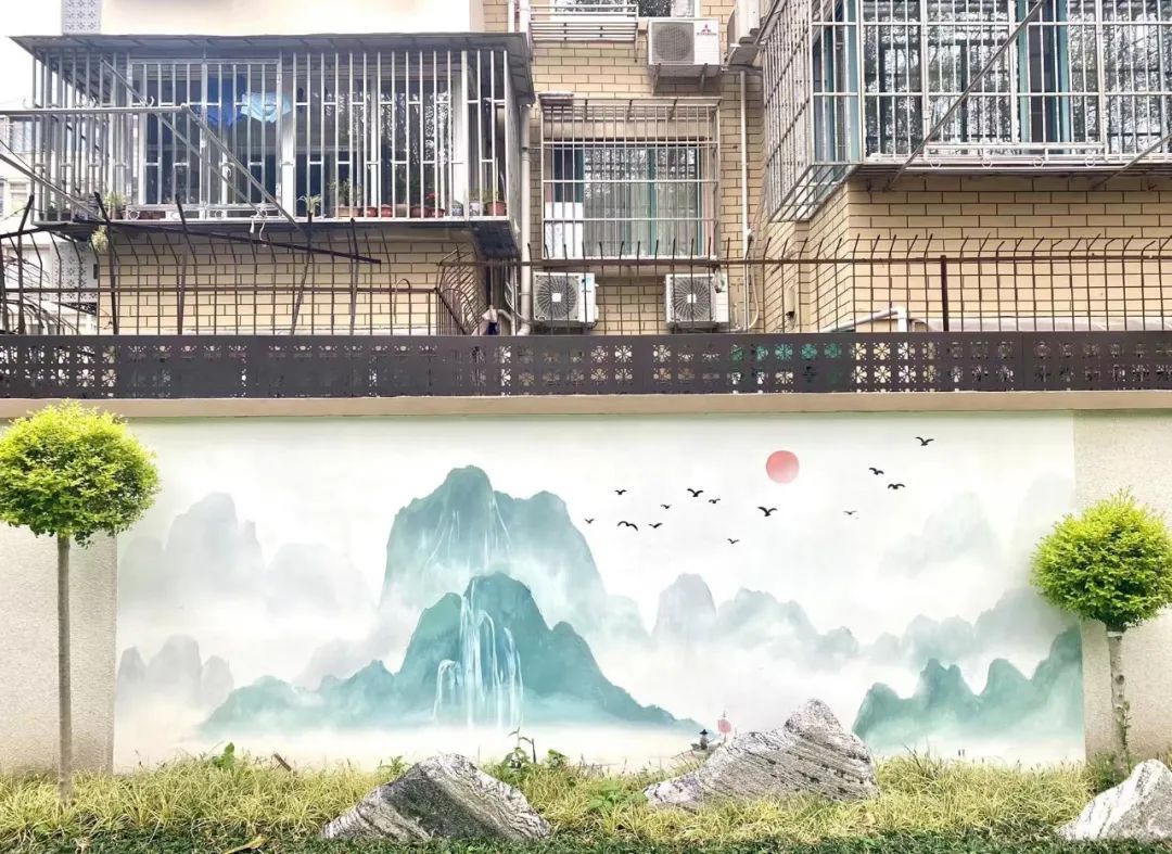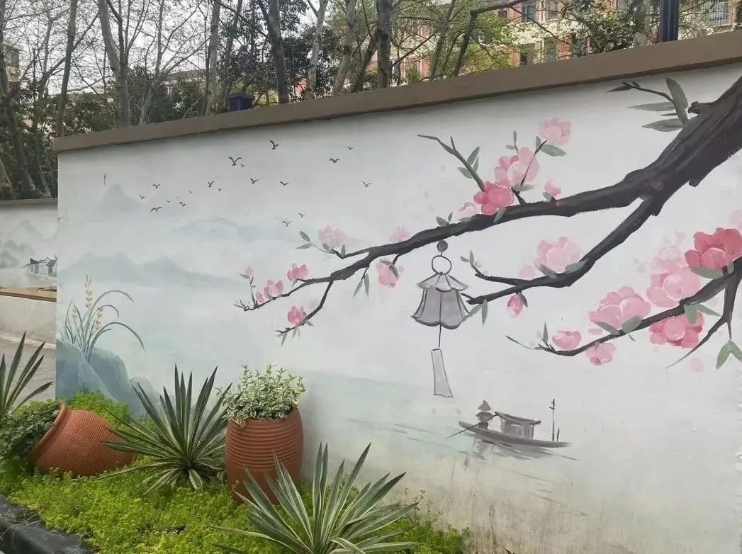 让人眼前一亮的,要数花园中一幅幅清新淡雅的水墨画,在画作的点缀下,整个小花园别有韵致。