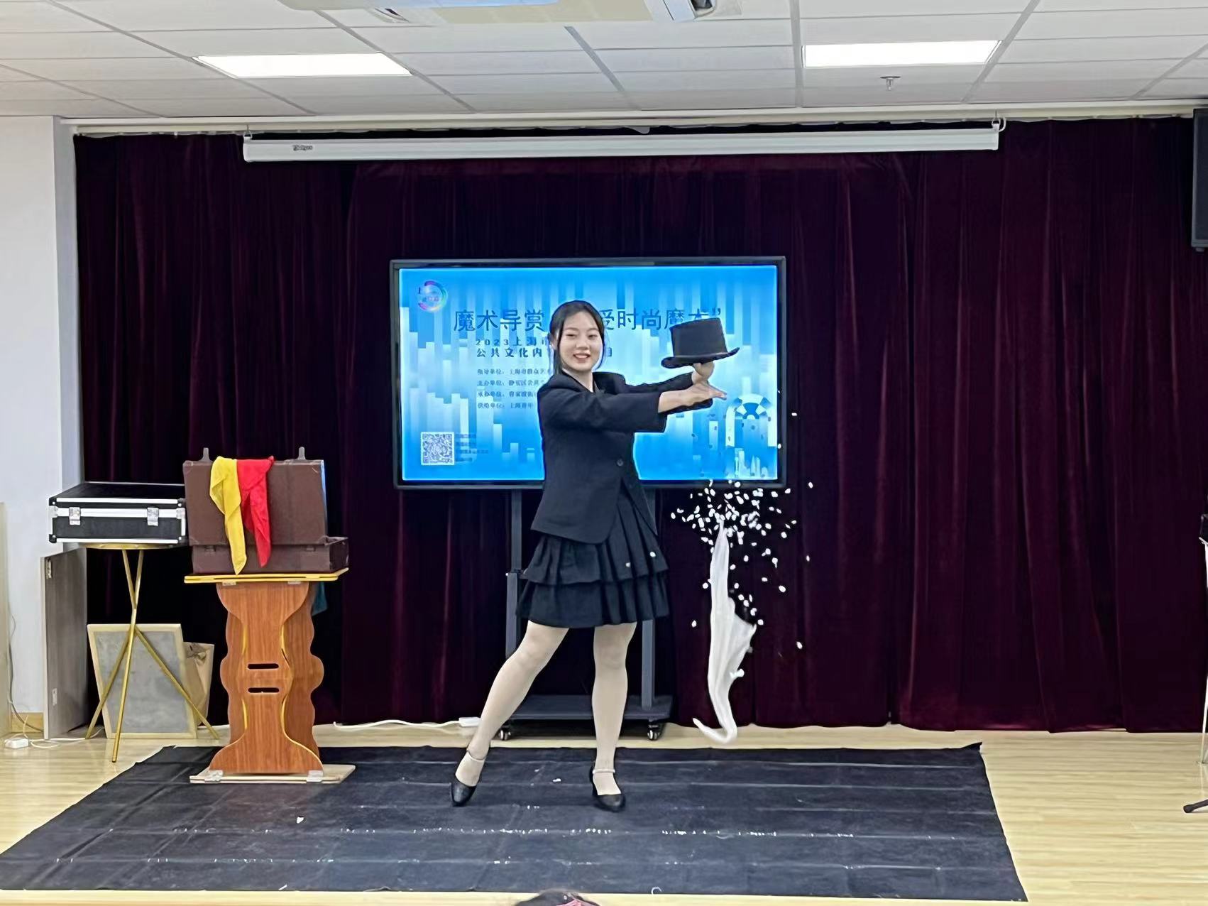 上海市公共文化配送项目——青年马戏团魔术师为居民带来魔术导赏,孩子们和家长在魔术师的揭秘下,学习了简单的小魔术,通过活动即增加了亲子关系,又接触到了不一样的知识领域。社区影视厅平时每周二、四下午2点向社区居民免费提供观影服务,活动当天也增场播放。