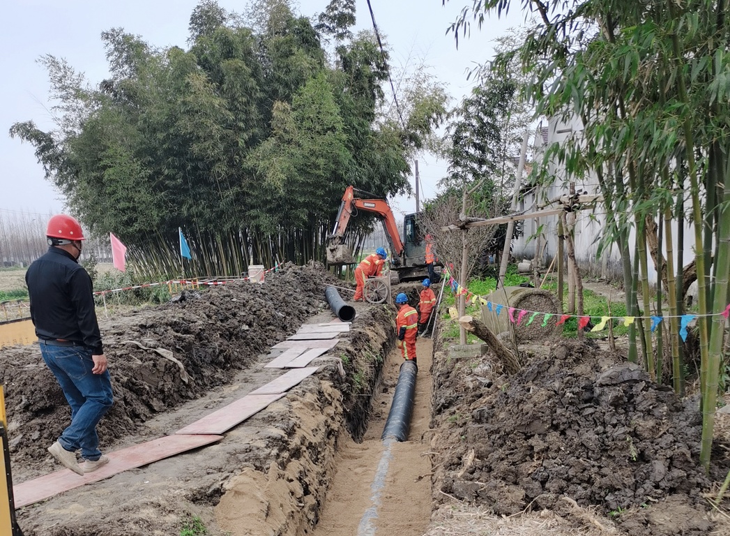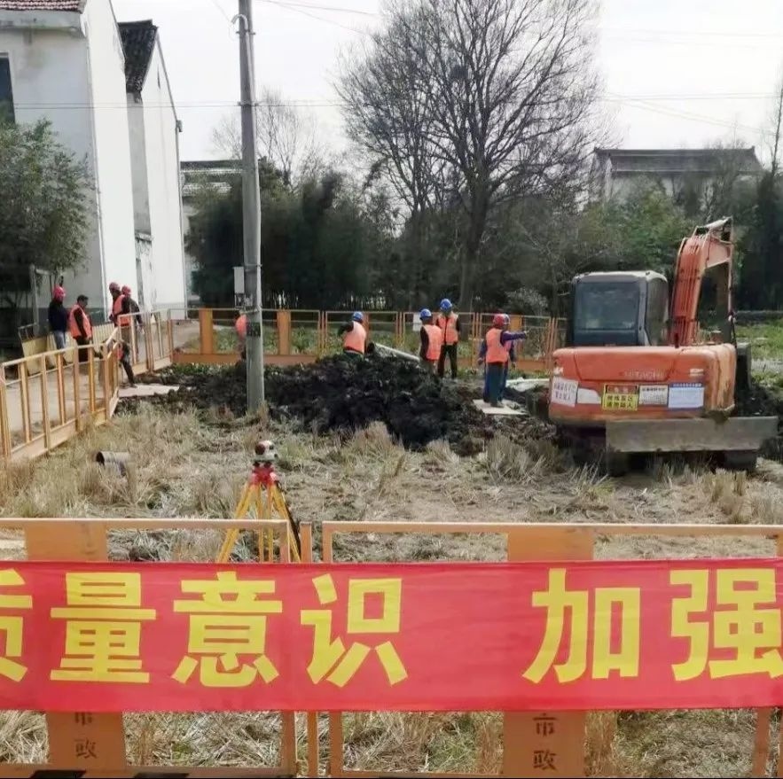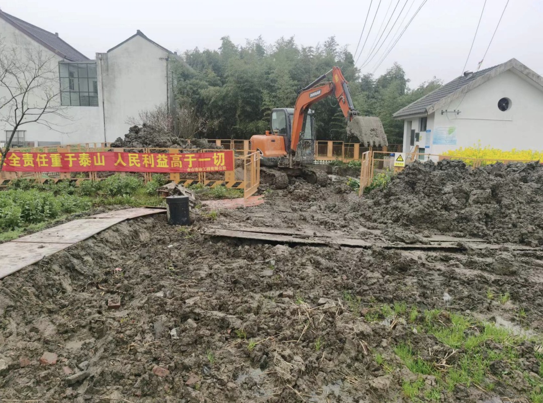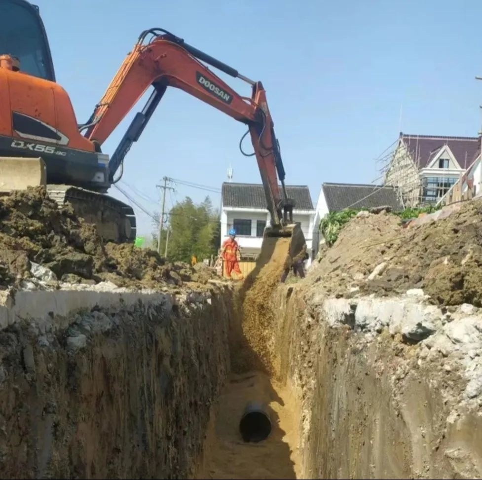 农村生活污水治理是优化环境质量的生态工程,也是提升群众生活品质的民心工程。为进一步提高污水处理设施运行效率,近日,朱泾镇正加快推进农村生活污水处理设施提标改造建设进度,在各村污水管网施工现场,挖掘机正在紧张作业,挖沟、取土,有条不紊,工人们将沟壕内的地面平整后,有序地将管道放入沟内。