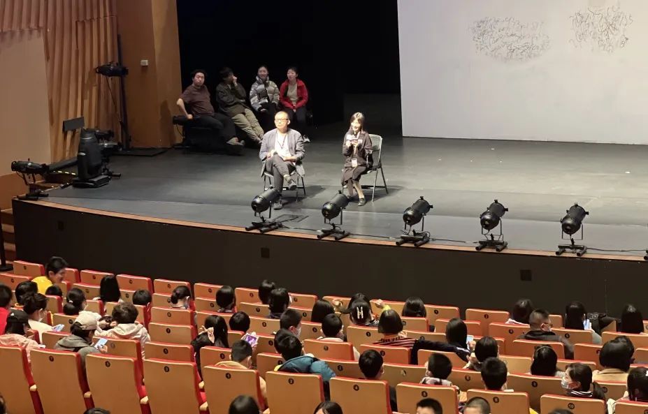 当天,在YOUNG剧场的线下开放日活动中,数十位小观众在台下观看新青年剧团的演员们彩排舞台剧《变形记》。对他们中的很多人来说,这还是第一次走进剧场、走近戏剧。戏剧背后的故事、剧场的魅力,无一不让孩子们着迷。