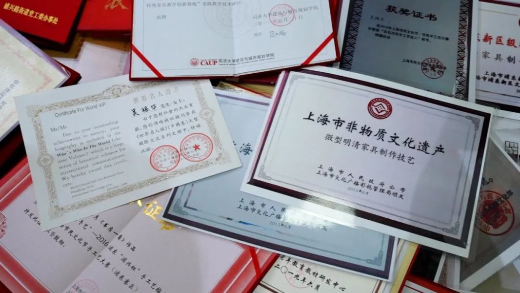 几十年来,吴根华到底做了多少件微型明清家具作品,他自己也记不清了,同样记不清的还有他那几个抽屉的荣誉证书和奖项。2012年,吴根华被命名为浦东新区非物质文化遗产项目——微型明清家具制作技艺代表性传承人,2015年,又被命名为上海市非物质文化遗产项目——微型明清家具制作技艺代表性传承人。