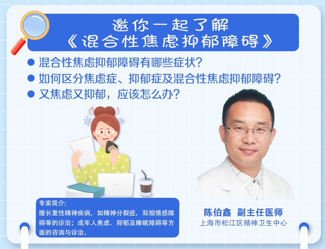 陈伯鑫表示,混合性焦虑和抑郁障碍的诊断标准是指需要抑郁和焦虑体验在一个患者身上同时出现,但是两组症状分别考虑时均不足以符合抑郁症或焦虑症的诊断,此时就要考虑混合性焦虑和抑郁障碍可能。该诊断确立还有一个必要条件,就是患者必须存在一些植物神经紊乱相关症状(头晕、头痛、颤抖、胸闷、腹胀、咽部异物感、尿频、尿急等),哪怕是间歇存在的也可以,但是一般持续时间超过一个月。
