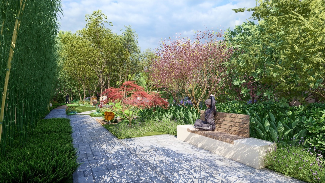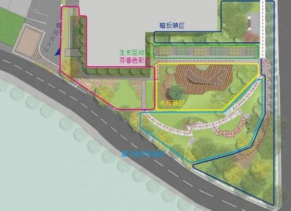 其中,芬香色彩区位于花园出入口的通道区,采用丰富的色彩花境,营造虚实结合、开合有度、步移景异的花园空间体验。