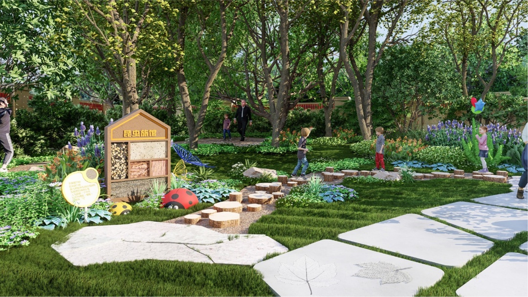 露天自然科普区将场地内原生的植物落叶拓印在汀步上,形成错落有致的园中小径;区域内种植香花、香草类植物,作为蝴蝶等昆虫的食源或寄主植物,营造小范围昆虫生活环境。