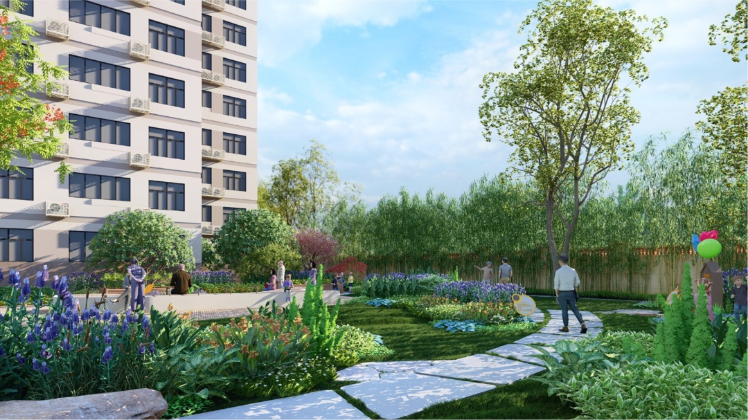 在阳光照耀下,草坪与色彩鲜艳的植物相互交错,供人休息的休憩座椅提升了居民的生活体验,激发社群活力;同时设置有适老化座椅,让社区老年人在沐浴阳光的同时,呼吸新鲜空气,享受自然给予的馈赠。