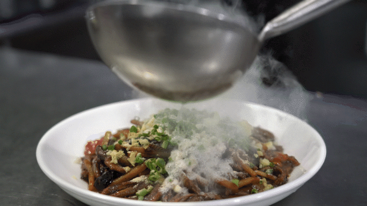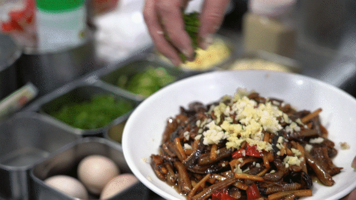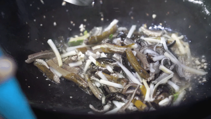 赤色的鳝丝淋上热油噼啪作响