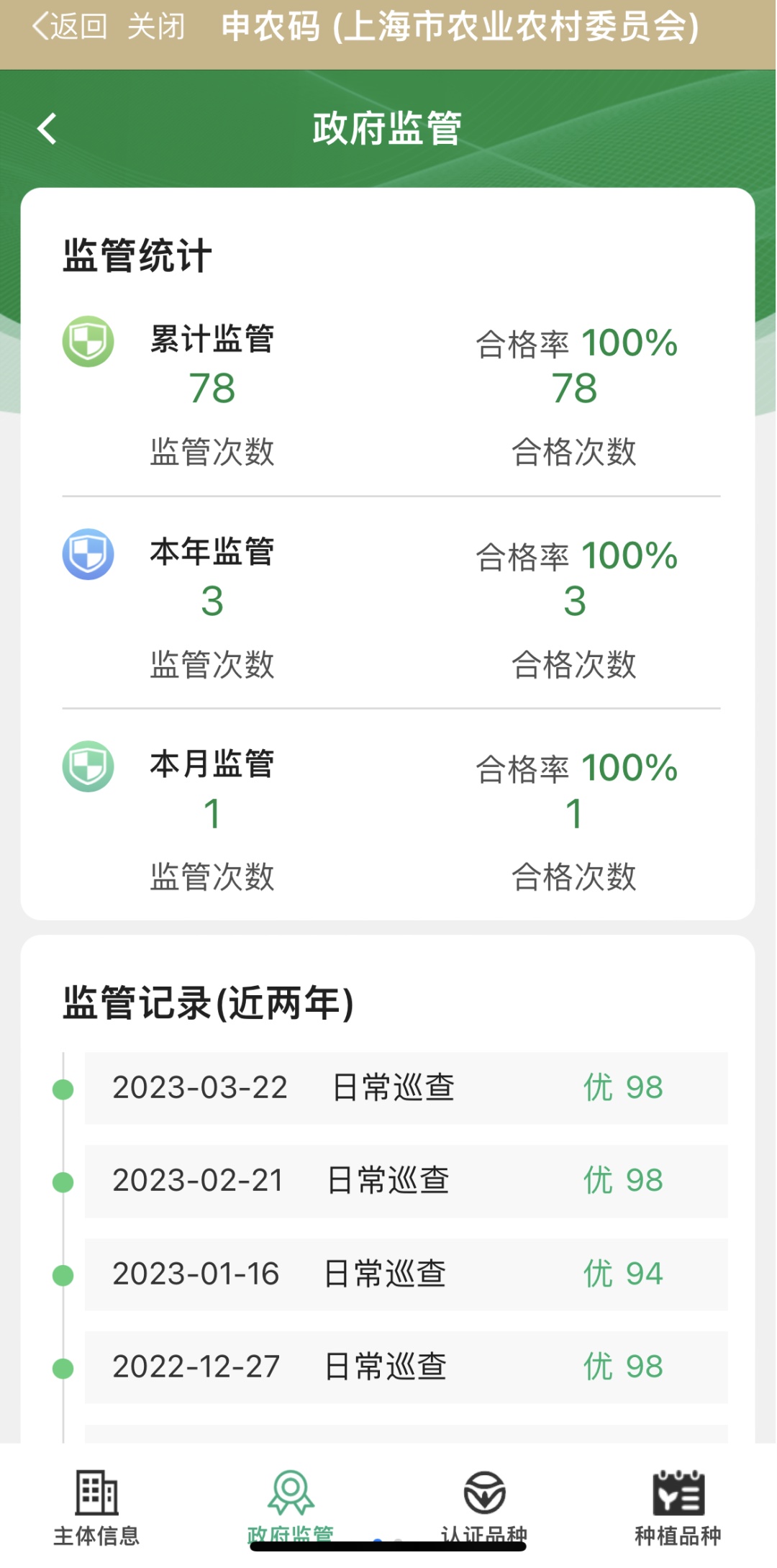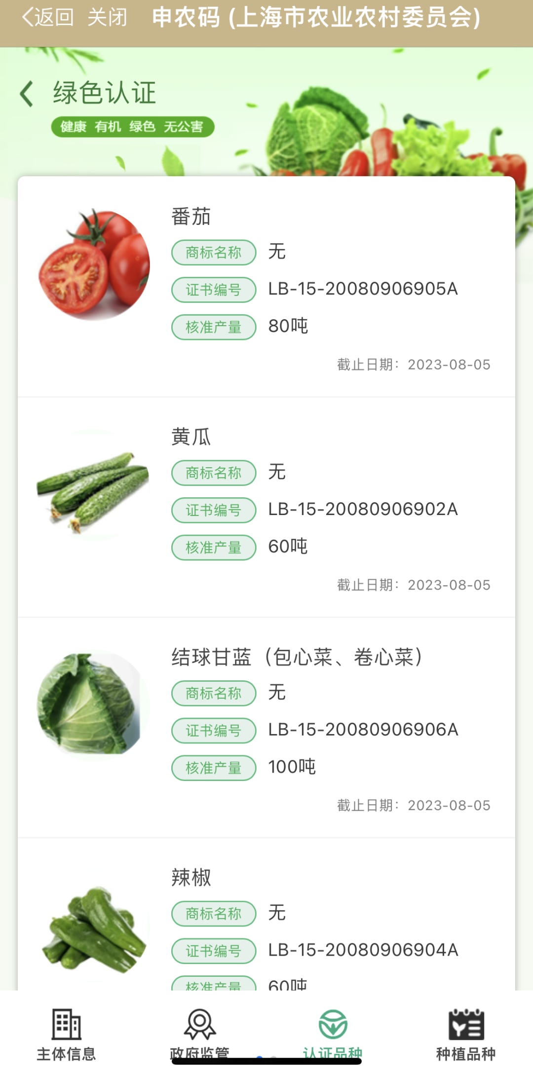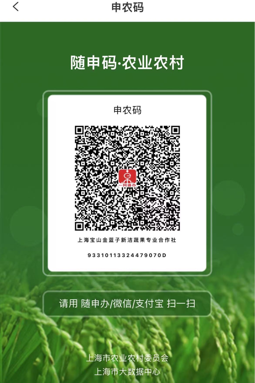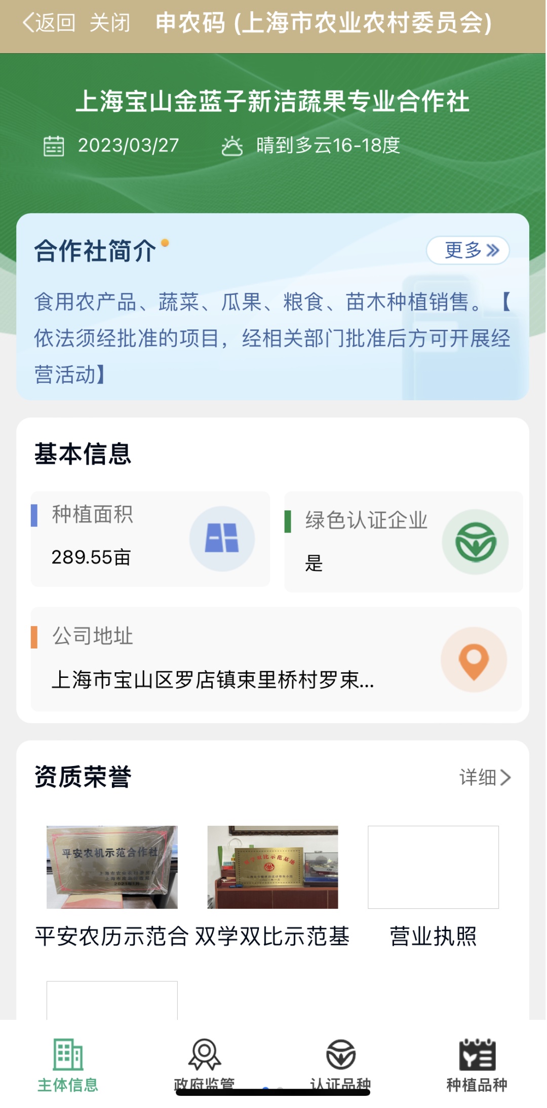 通过使用随申办、微信、支付宝等APP的扫一扫功能对实体牌进行扫描(大家可以扫描文中的二维码尝试一下哦),能够获取合作社的详细信息,如主体信息、政府监管、认证品种、种植品种等。这既方便企业对自家的农产品进行宣传,也方便消费者查看企业相关信息,放心消费。