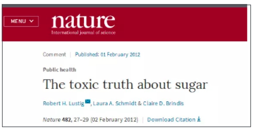 2012年2月,发表在《自然(Nature)》杂志的一篇题为《公共卫生:糖的毒性真相》(Public health: The toxic truth about sugar)的文章指出:糖就像烟草和酒精一样,而且糖的危害远在脂肪和卡路里之上。